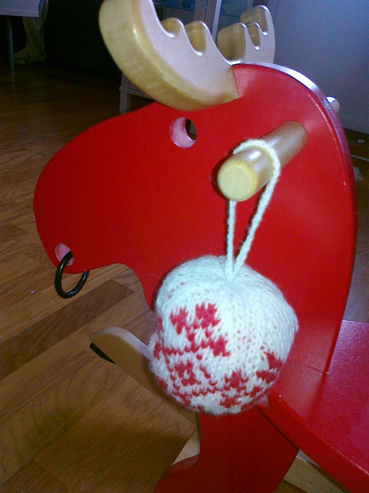 Jeg har fått tusket til meg en julekule. Dessverre kan jeg ikke skryte på meg å ha strikket den selv, den kom til meg under bordet - bokstavelig talt. Og jeg elsker den. Den koser seg hos huselgen (den med skuddsår i skinka).